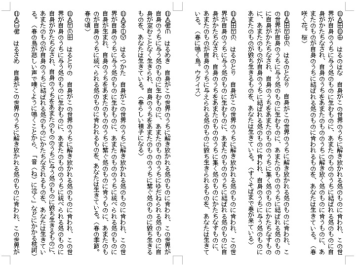 そして、この世界から世界のあまたのものと一つに結ばれた大いなる命として祝福されんとして、この世界をなすあまたのものがあなたのうちに余す処なく与えられ、あなたのうちで新たな魂として育まれてくるのを、あなたは肌を通して感じ取ることができるのです。※古来、春は、新たな魂を受け取る季節として受け取られていました。
