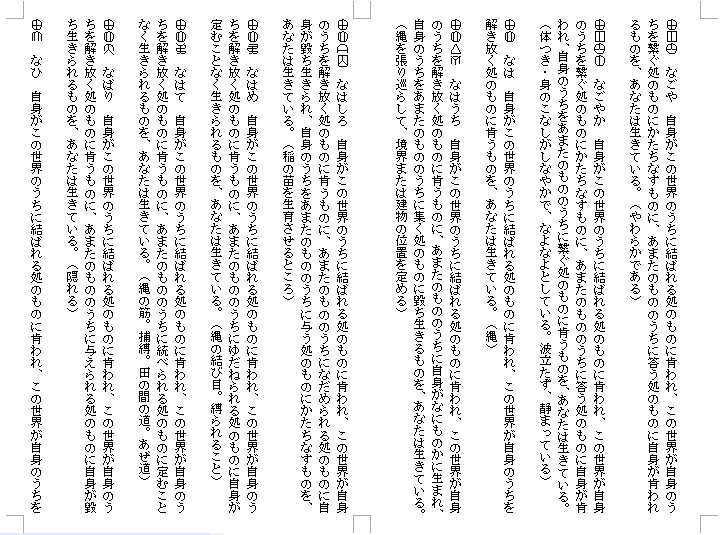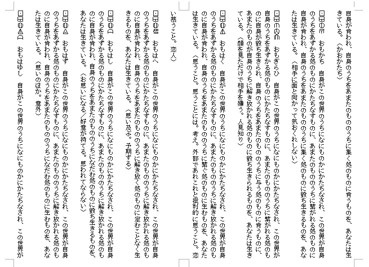 あまたのものが自身のうちに与えられる処のものに毀ち生きられるものを、あなたは生きている。」