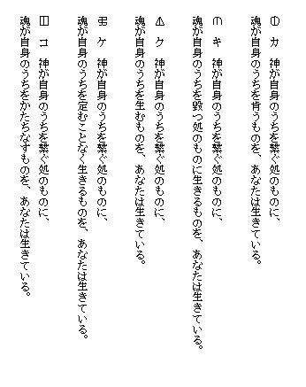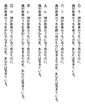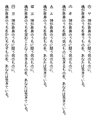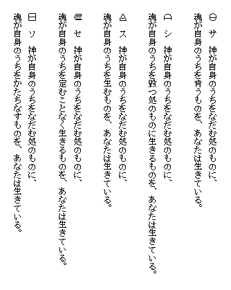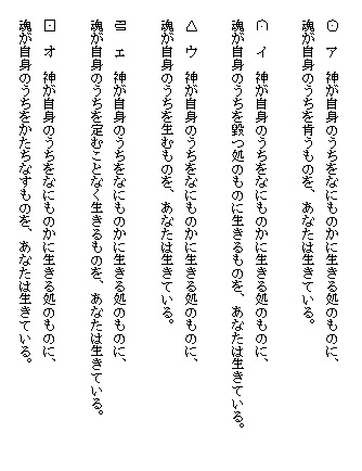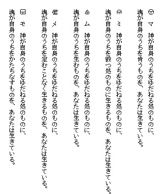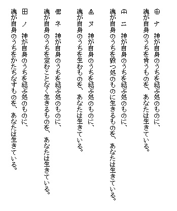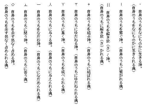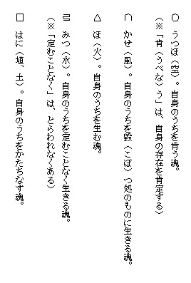 ここに示しているものは筆者が仮りに言霊の規則として提案したものであって、読者は自由に、この言霊の海を遊ばれることを望む。
