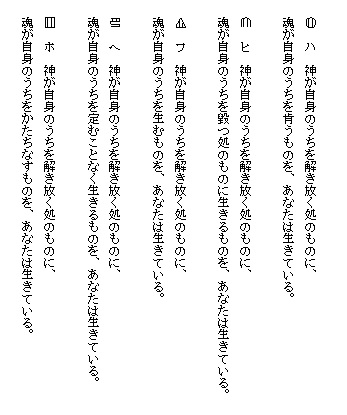 自身がこの世界のうちになにものかに生きられ、この世界が自身のうちをなにものかに生きるものに、あまたのもののうちに自身がなにものかに生きられ、自身のうちをあまたのもののうちになにものかに生きる処のものに、あまたのものが自身のうちになにものかに生きられ、自身のうちをあまたのものがなにものかを生きるものに、あまたのもののうちになにものかに生きられる処のものに自身がなにものかを生き、あまたのもののうちを生きる処のものに自身がなにものかに生きられる処のものについて。